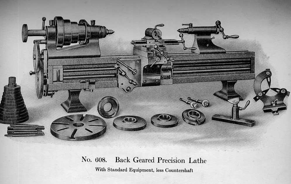 designed by Edward Rivett. It had the second largest production of any of the larger Rivett lathes, about 1800 total. The basic lathe changed little from its introduction in 1920 until production ceased in 1960. Approximately 1800 units were produced. These lathes could be found in laboratory shops in places like Harvard, Johns Hopkins and Yerkes Observatory. They were present in leading edge industrial laboratory shops as well. One on display at the Charles River Museum, is listed as the first lathe at Polaroid corporation. There are several in the Edison shops in West Orange, NJ. Part of the reason for the large production of the 608 was its popularity with the military during World War 2 where it was used on shipboard, in maintenance depots and shipped in large quantities to Great Britain. The 608 is considered my many familiar with them to be one of the finest small lathes ever made. 608 Sales Brochure (PDF) 608 Price List from 1943 (PDF) 608 Manual (PDF) |